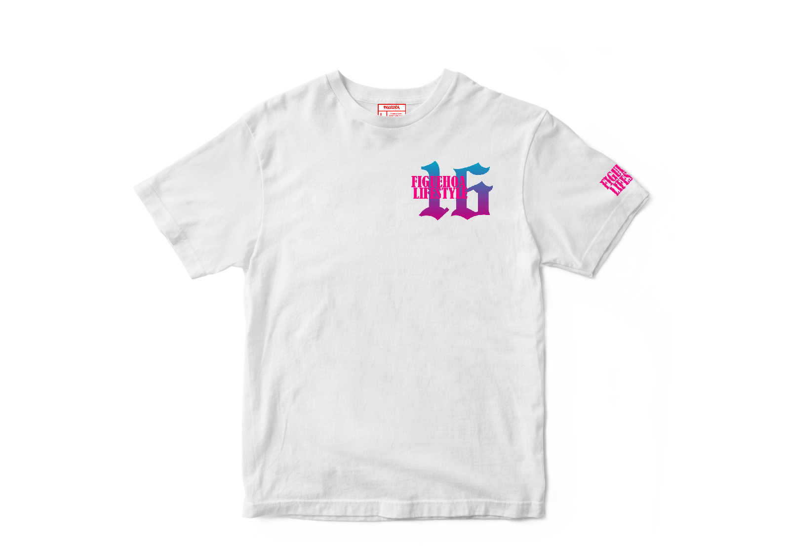 On the left chest, the Figuehoa Lifestyle logo pops in a striking pink and blue gradient, overlaying a large stylized “16” in matching colors.